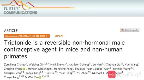 医院的中心实验室副主任秦卫兵博士为该论文的共同第一作者,医院国家卫生健康委男性生殖与遗传重点实验室主任唐运革教授为该论文的共同通讯作者。该成果的发表,标志着广东男性避孕药研究领域处于世界前列。