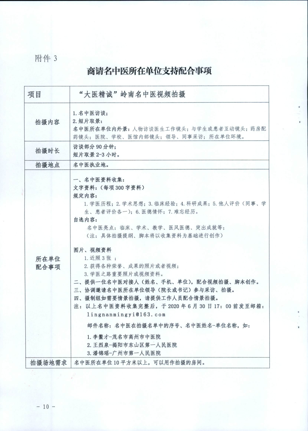 拍摄名单详见附件2,资料收集格式详见附件3,请于2020年6月30日17:00前发至工作邮箱:lingnanmingyi@163.com(英文字母为“岭南名医”的拼音)。