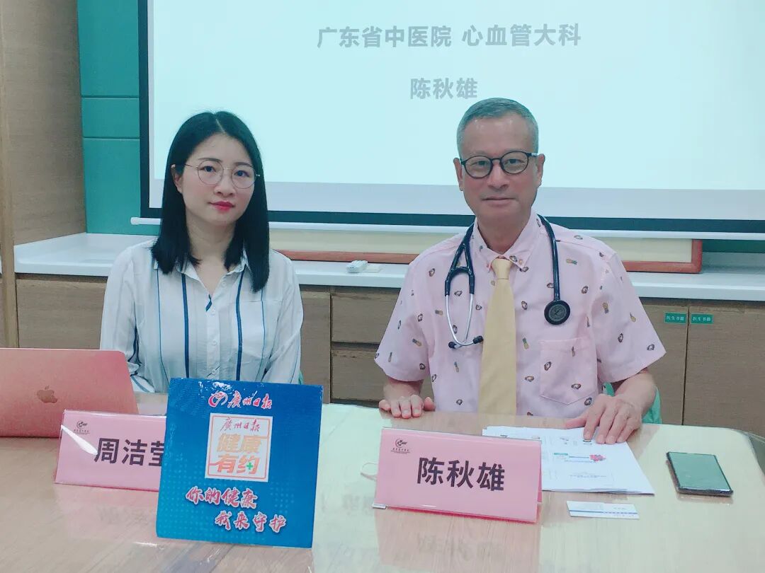 广东省中医院心血管大科主任陈秋雄教授(右)和广州日报全媒体记者周洁莹(左)