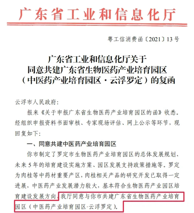 近日,云浮市人民政府门户网站发布消息,广东省工信厅函复云浮市政府,同意与云浮市共建广东省生物医药产业培育园区(中医药产业培育园区·云浮罗定)。