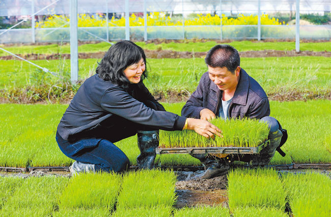 3月25日,光山县罗陈乡张楼村全国种粮大户刘正礼在查看秧苗发育情况。刘正礼从山东省引进苗木花卉育苗基质,通过8年科研和反复试验、改良,成功掌握了无土育秧新技术,开启了水稻无土育秧栽种的“新模式”。(谢万柏 摄)