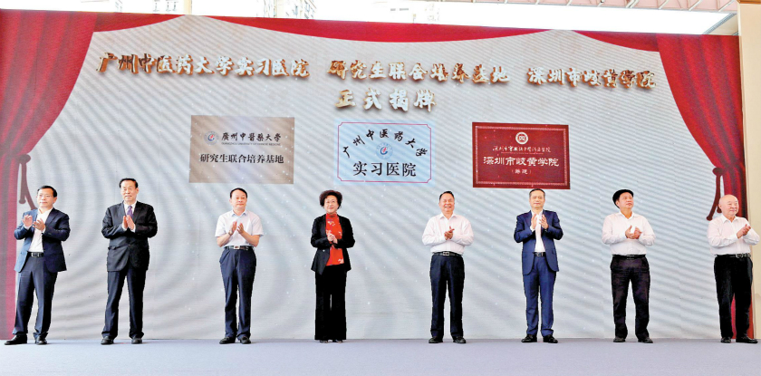 ▲深圳市岐黄学院和广州中医药大学实习医院、研究生联合培养基地揭牌落户宝安纯中医治疗医院