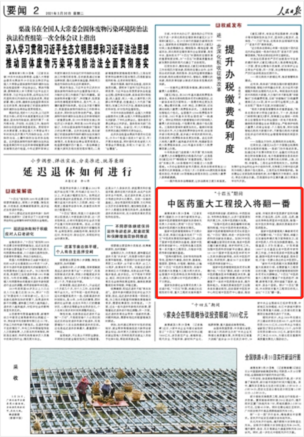 人民日报:“十四五”期间,中医药重大工程投入将翻一番