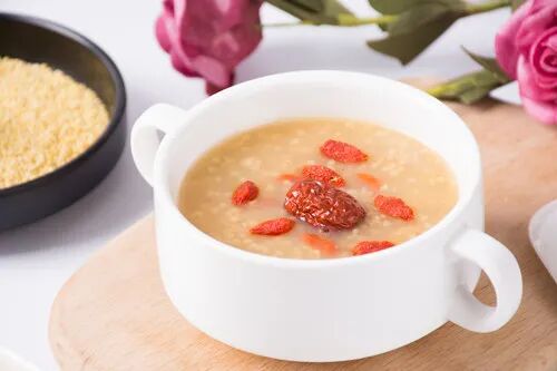 小米100克,怀山药30克,大枣5枚,红糖30克,共煮粥食用。可健脾胃、益气血。用于治疗脾胃虚弱之泄泻及气血不足体质的补益。