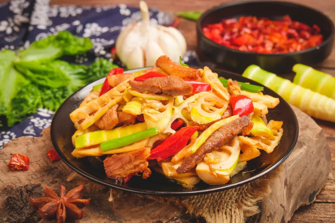 做法:将鲜竹笋、香菇、黑木耳、金针菜洗净后用清水浸泡1小时,捞出材料后去水,前三味材料与猪瘦肉均切成细条状。在锅内倒入植物油烧热,加入上述所有材料及适量食盐后反复炒至熟透即可。作为正餐菜肴,可分次随量食用。