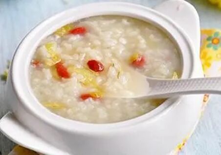 做法:将枸杞子拣洗干净备用。把粳米淘洗,放入沙锅中,加适量清水,用小火煮至米粒开花,加入猪肉末、豆豉汁、枸杞子、菊花、精盐、味精、麻油,稍煮后便可食用。食时可调入红糖。