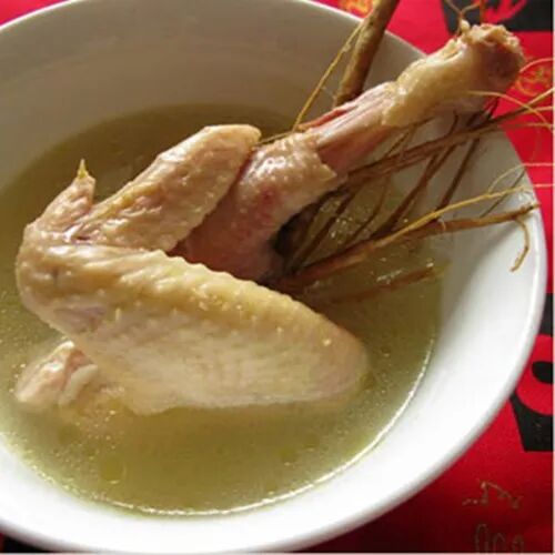 材料:老母鸡1只、猪大排250克、鸡骨草100克、杏仁20克。姜片、盐。