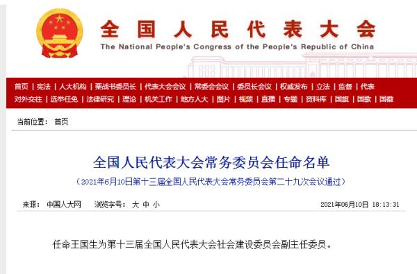 王国生任第十三届全国人大社会建设委员会副主任委员