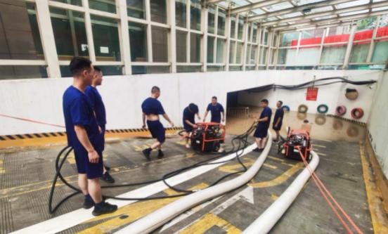 信阳市应急救援支队赶赴浉河区弘运小区鑫鑫广场地下车库进行排涝救援。