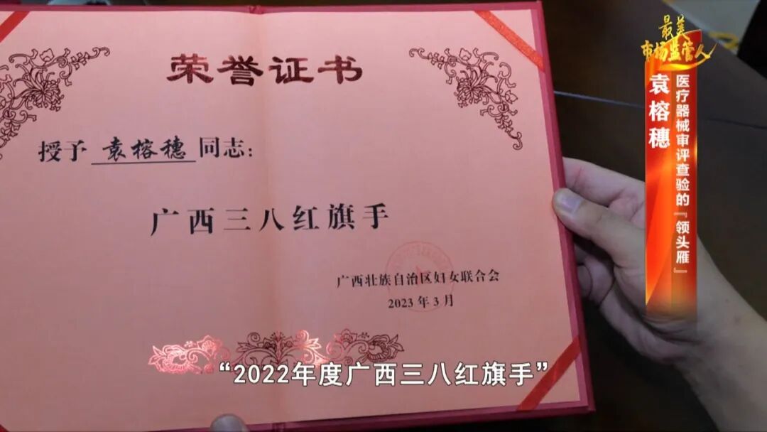 2020—2023年截至目前,袁榕穗和同事助力广西新增第二类医疗器械生产企业193家,首次注册产品1280个,审评时限平均缩减53%。因表现出色,她先后荣获 “全国市场监管系统抗击新冠肺炎疫情先进个人”、“农工党抗击新冠肺炎疫情先进个人”、“2022年度广西三八红旗手” 、“2021广西食品药品审评查验中心“记功,所在科室荣获“2020年度审评查验工作突出贡献嘉奖”。