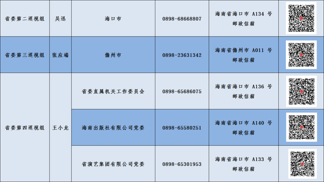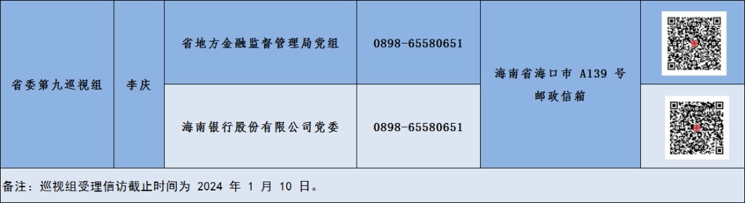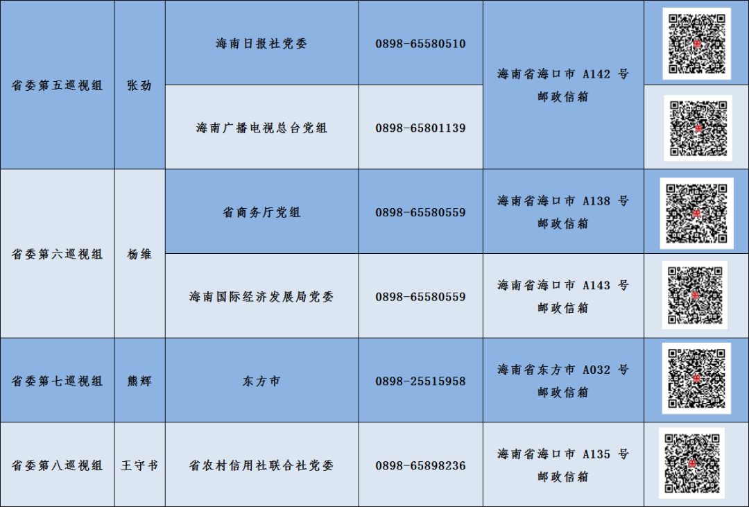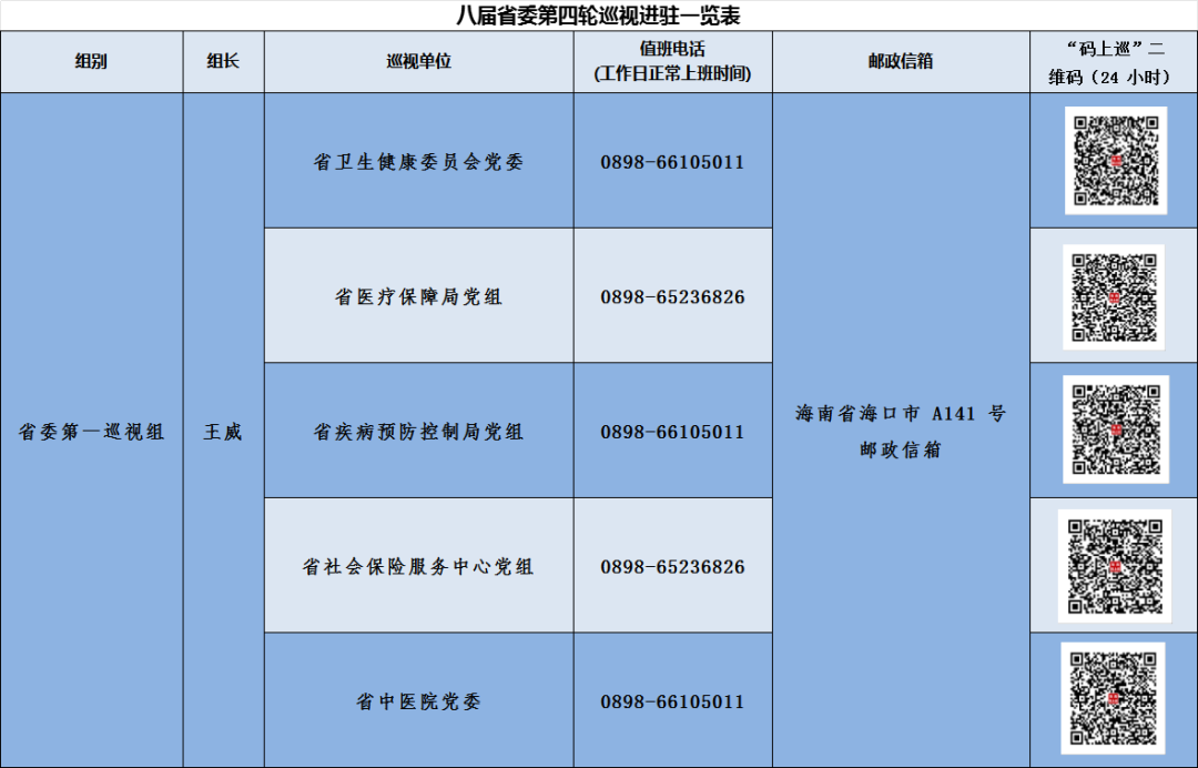 据悉,本次巡视为期3个月左右,巡视期间,各省委巡视组设置了专门值班电话、邮政信箱,并首次启用海南“码上巡”系统。该系统既方便快捷,又兼顾信息安全和工作效率,可以有效破解熟人社会干扰,打消干部群众心理上的顾虑。群众通过手机扫描海南“码上巡”信访举报二维码,即可实现点对点反映问题“一键直达”。